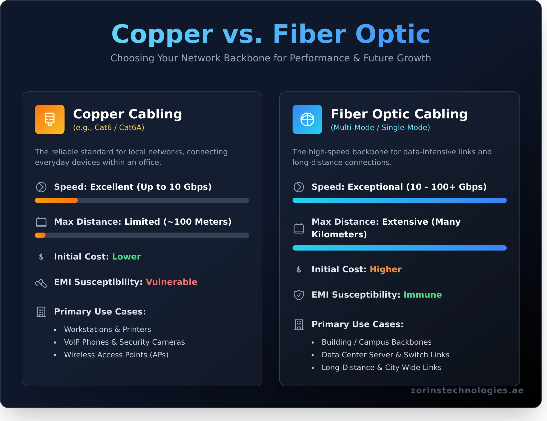 CharacteristicCopper Cabling (e.g., Cat6/Cat6A)Fiber Optic CablingSpeedExcellent (Up to 10 Gbps)Exceptional (10 Gbps to 100+ Gbps)Max DistanceLimited (Up to 100 meters)Extensive (Many kilometers)Installation Cost (AED)Lower initial cost per connection pointHigher initial cost for equipment & laborInterferenceSusceptible to electromagnetic interference (EMI)Completely immune to EMI