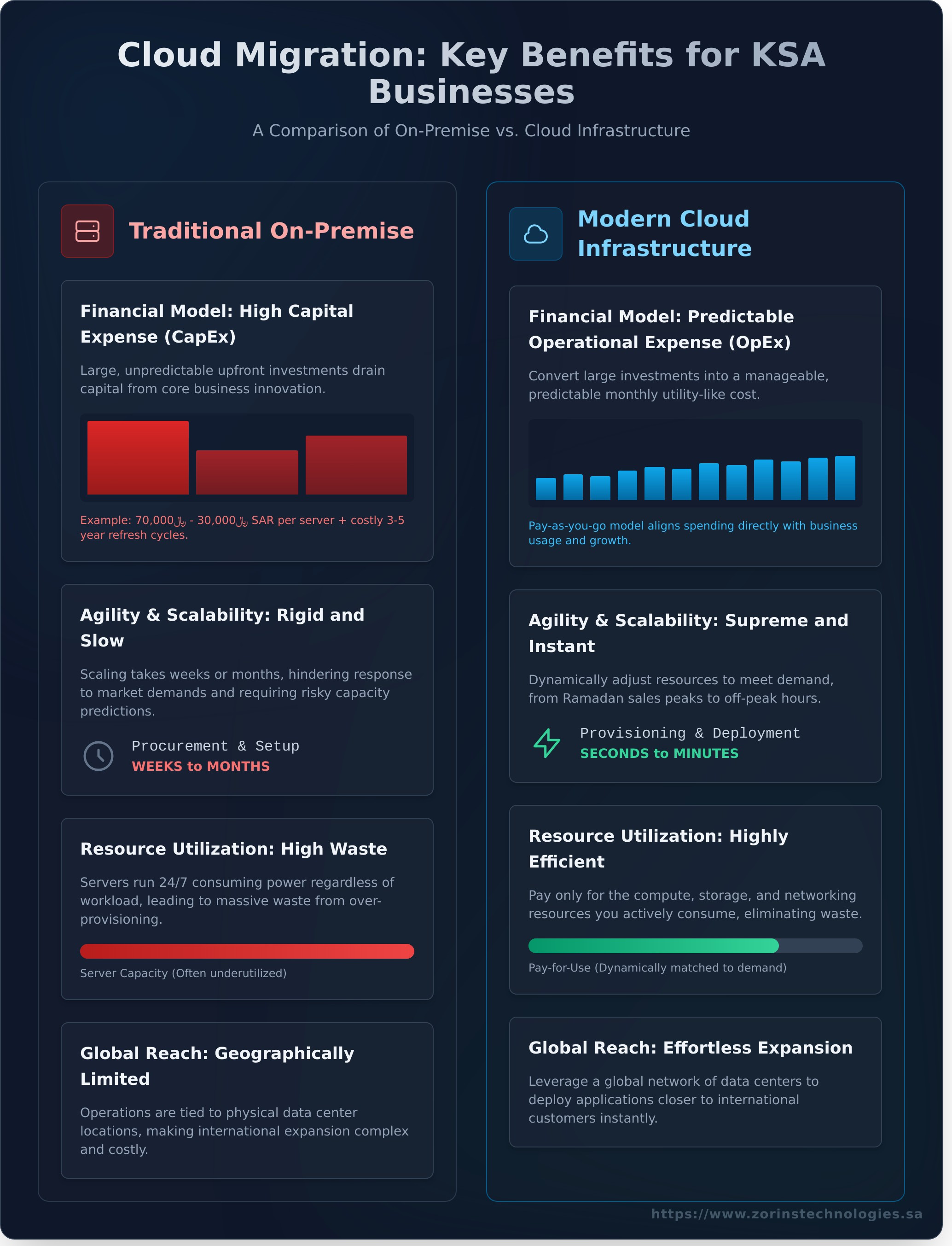 While there is an initial investment, migrating to the cloud significantly reduces long-term Total Cost of Ownership (TCO). On-premise infrastructure requires substantial capital expenditure (CapEx) on servers and hardware, plus ongoing operational costs for power, cooling, and maintenance, which can run into hundreds of thousands of Riyals. The cloud converts these large, unpredictable expenses into a predictable monthly operational expense (OpEx), optimizing your IT budget for sustainable growth and eliminating costly hardware refresh cycles.
